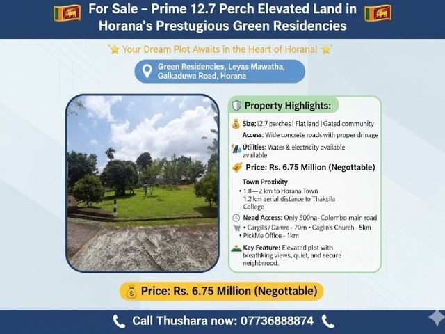 හොරණ නගරයට ආසන්නව, *Green Residencies* හී සන්සුන් හා ගේට්ටු සහිත නිදහස් වටපිටාවක පිහිටි, පර්චස් 12.7ක *සමතලා, නිරවුල් ඉඩමක්* දැන් විකිණේ. පවුලක් සඳහා නිවෙසක් සෑදීමට හෝ අනාගත ආයෝජනයකට ඉතාමත් වටිනා අවස්තාවක්!